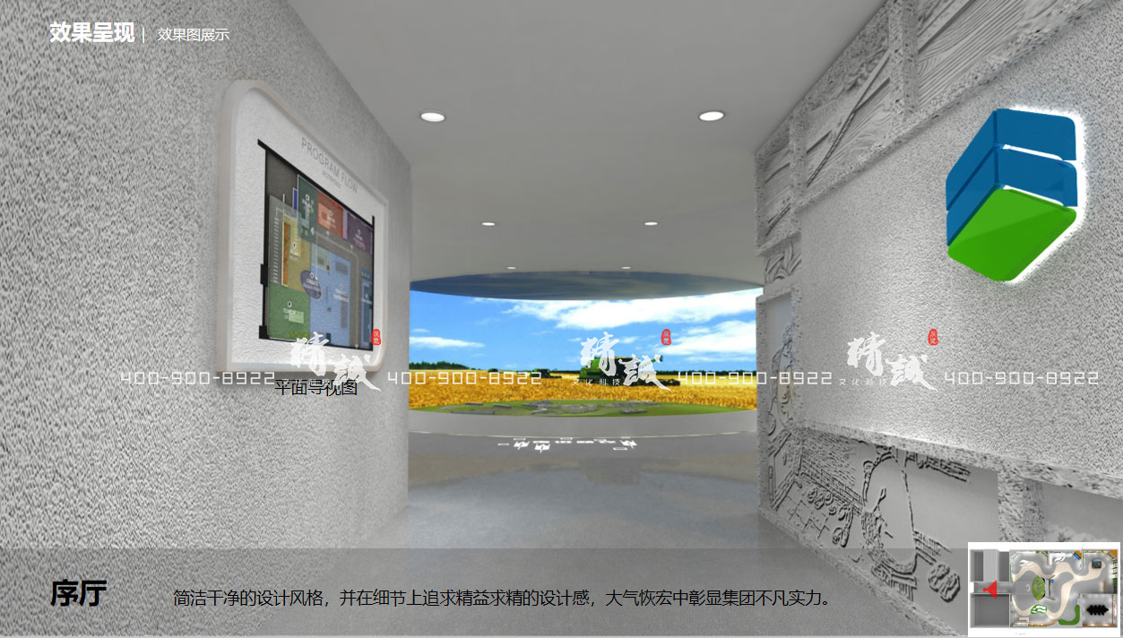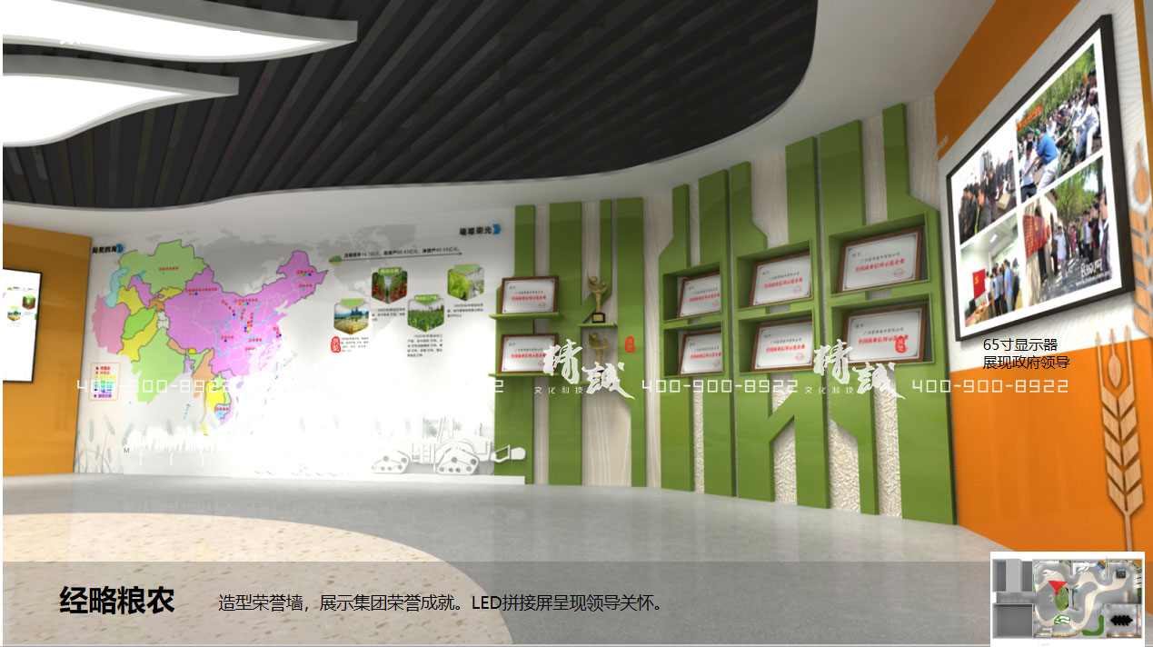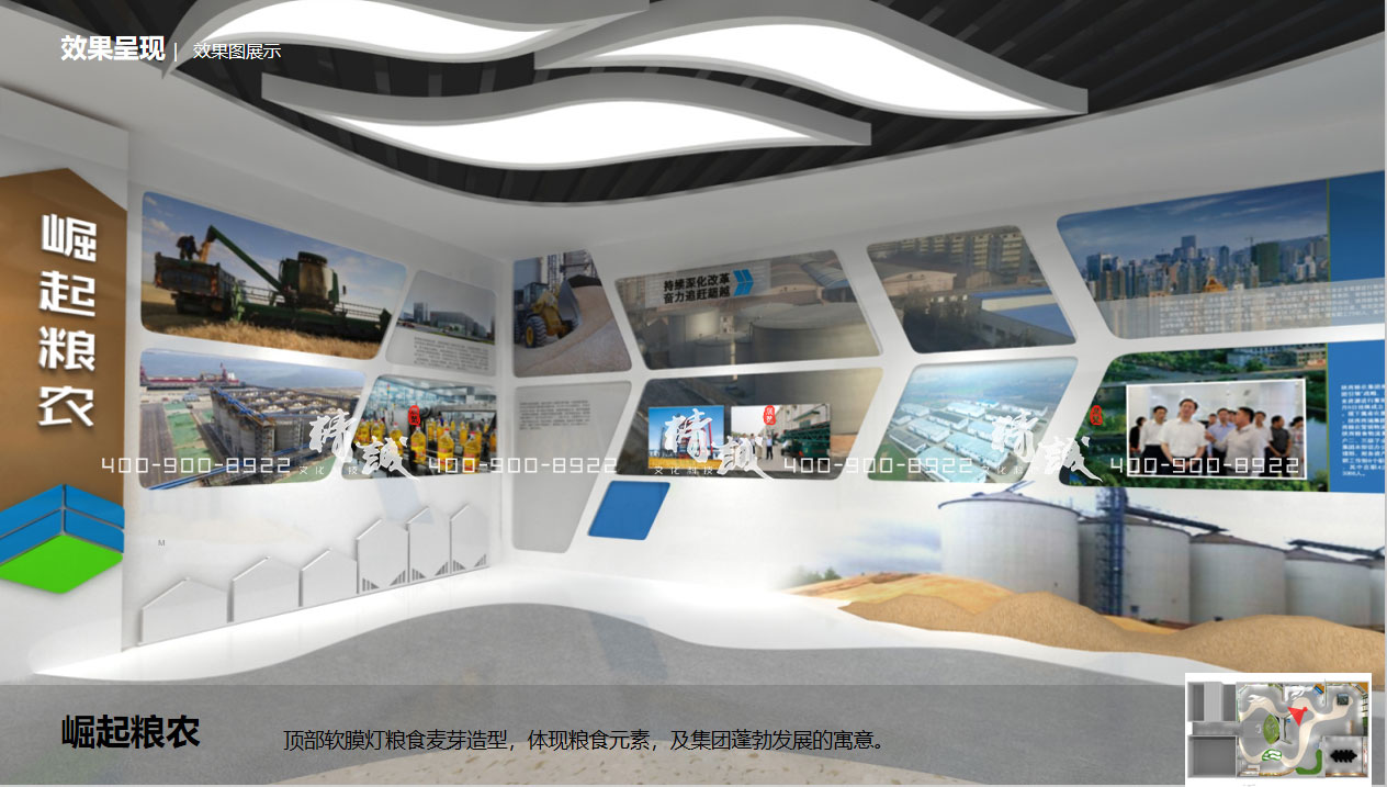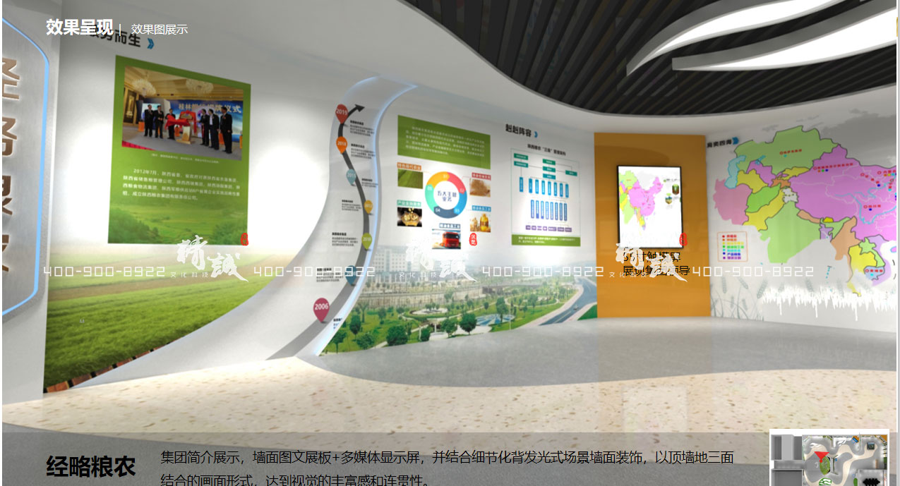 2.经略粮农:集团展厅简介展示,墙面图文展板+多媒体显示屏,并结合细节化背发光式场景墙面装饰,以顶墙地三面结合的画面形式,达到视觉的丰富感和连贯性。