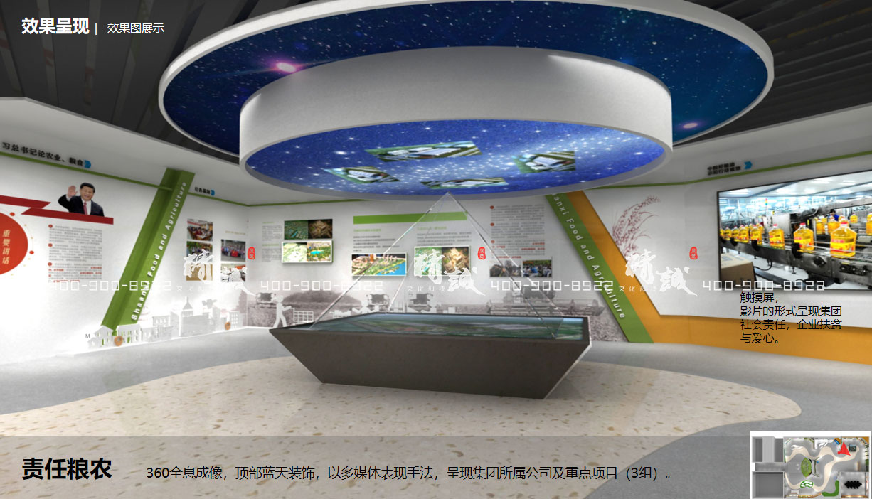 5.责任粮农:360全息成像,顶部蓝天装饰,以多媒体表现手法,呈现集团所属公司及重点项目(3组)。