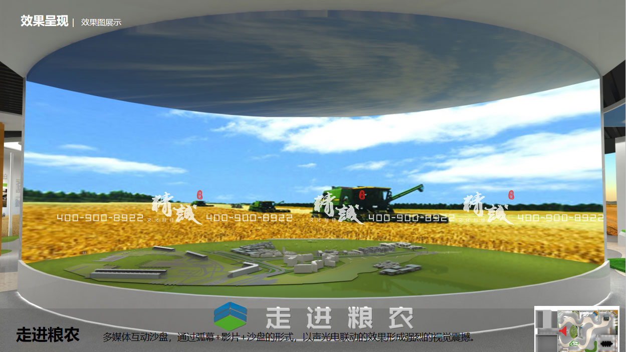 1.走进粮农:多媒体互动沙盘,通过弧幕+影片+沙盘的形式,以声光电联动的效果形成强烈的视觉震撼。