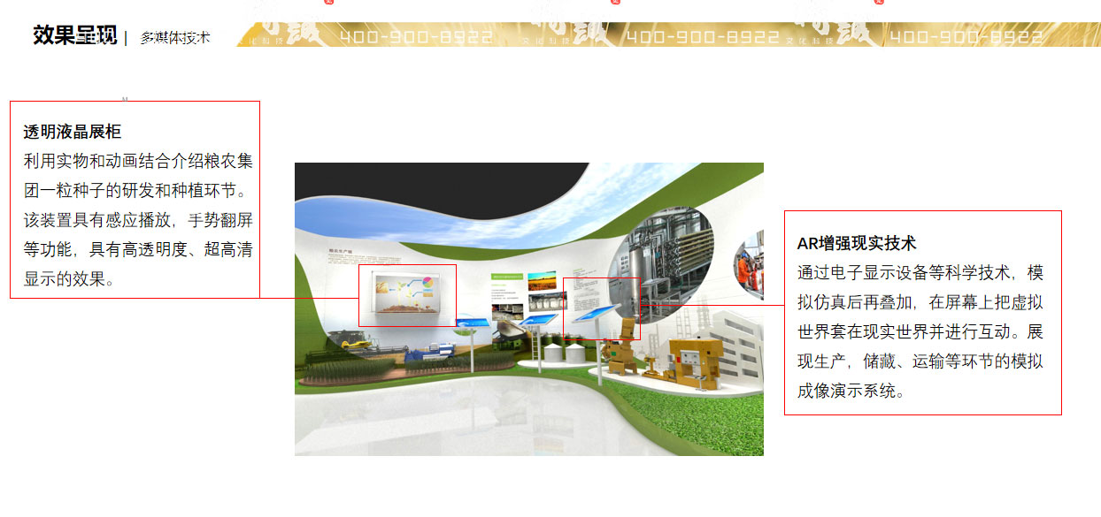 场景体验区,设置五大体验板块,分别以透明液晶屏,AR,液晶屏等多媒体技术,展现粮农集团从生产到物流仓储及质量把控等环节的技术详细呈现。