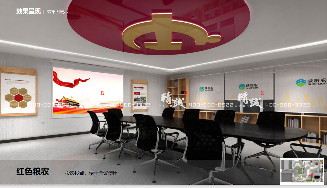 8.红色粮农:顶部党徽,墙面党旗党徽展板,并展示党建载体,党风廉政建设等。投影设置,便于会议使用。