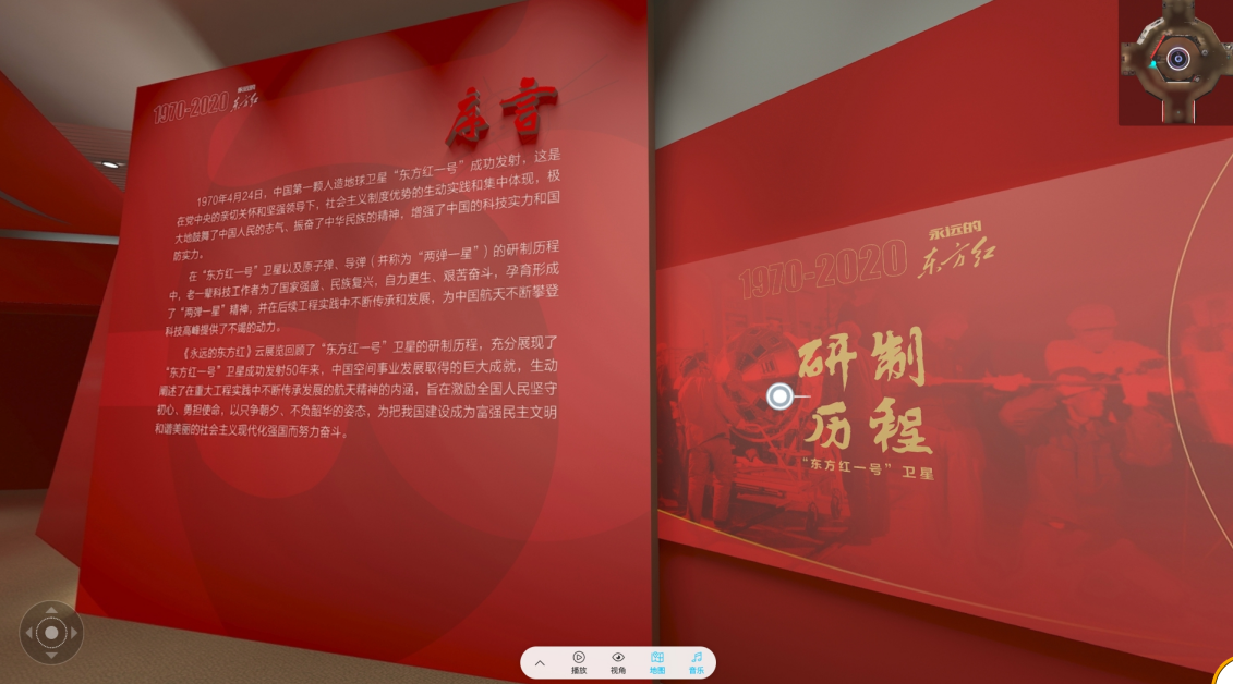 “永远的东方红”云展览是中国国家博物馆..次充分利用三维建模、全景漫游等数字技术,汇聚多媒体资源,在虚拟世界倾力打造的线上云展,..次在5G通讯技术的有力支撑下与多平台联动直播,标志着国博加速向线上拓展、向云端延伸,迎接智慧博物馆时代的来临。公众在云展览启幕后可随时随地参与体验、互动交流。配合此次云展览,国家博物馆联合中国空间技术研究院还出品了三款H5小程序,邀观众重温“东方红一号”研制历程,挑战奏响《东方红》曲谱,为“东方红一号”点赞。