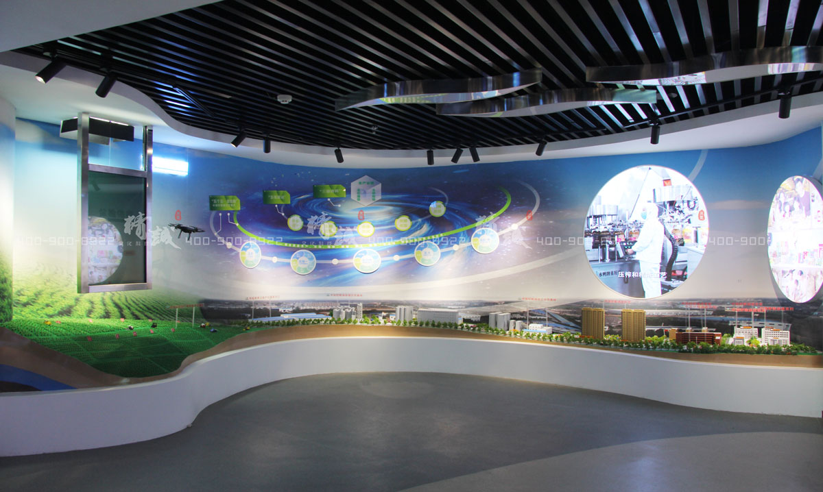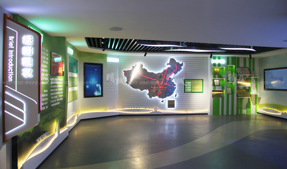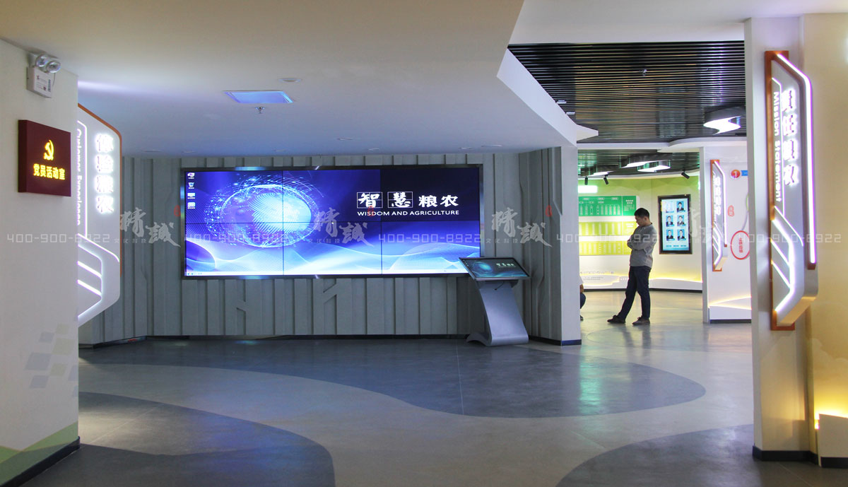 该板块顶部软膜灯粮食麦芽造型,体现粮食元素,及集团蓬勃发展的寓意。墙面图文展示配合数字显示屏展现粮农的发展成就及未来,内容可及时更新。