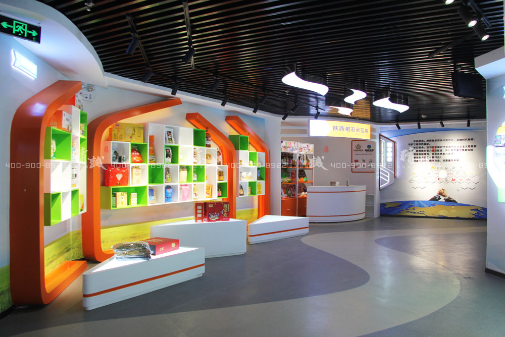 粮仓造型,独具匠心的产品展架设计,陈列粮农产品,配合展示粮农集团服务体系。微缩示范店,线上体验,线下销售的体验,及实体售货柜陈列。