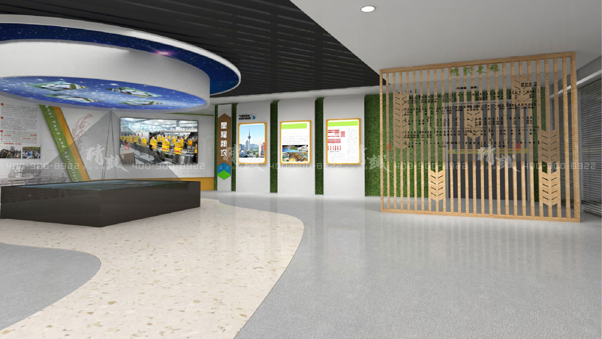 采用液晶显示屏打造一面荣誉墙,展现员工之星、企业之星、产业之星等内容。格栅造型隔断,展现粮农之歌,有效隔开空间并考虑展厅的视觉通透性。