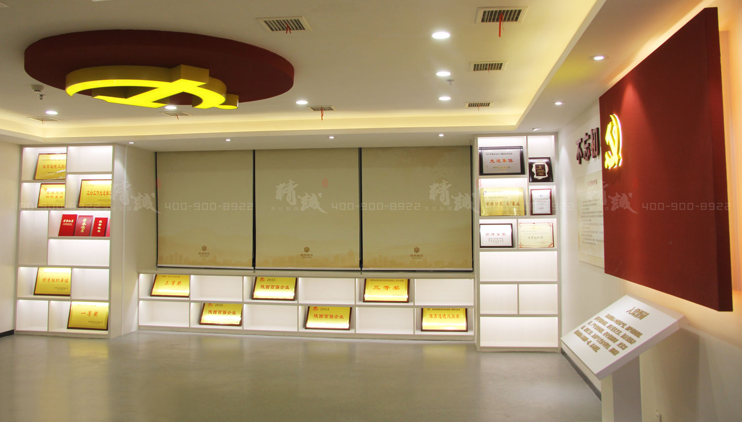该板块采用墙面图文展板+多媒体显示屏,并结合细节化背发光式场景墙面装饰,以顶墙地三面结合的画面形式,对集团的发展、荣誉进行展示,达到视觉的丰富感和连贯性。
