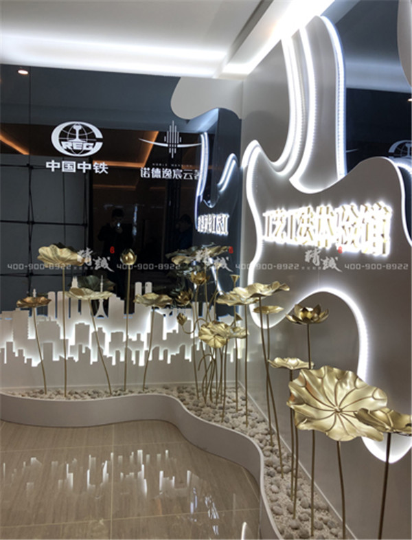 展厅入口利用远近视觉感,错落有致的高铁抽象造型加灯光辅助照明,犹如企业向告诉列车驶向国际的道路上。