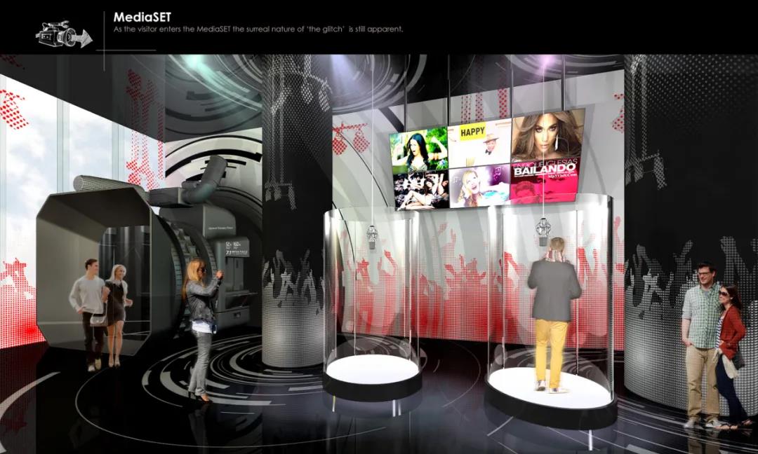 媒体矩阵:当参观者走过屏幕时,他们会发现自己置身于一台旧电视里,他们将会被抽象的电子部件所构成的丰富环境所震撼。