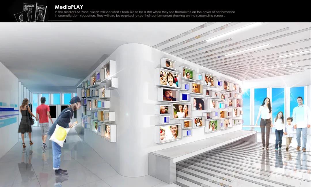 媒体播放区:在“媒体播放区”,游客们会看到自己出现在《表演与特技》的封面上时,感觉就像一个明星,他们也会惊讶地看到他们的表演在周围的屏幕上。