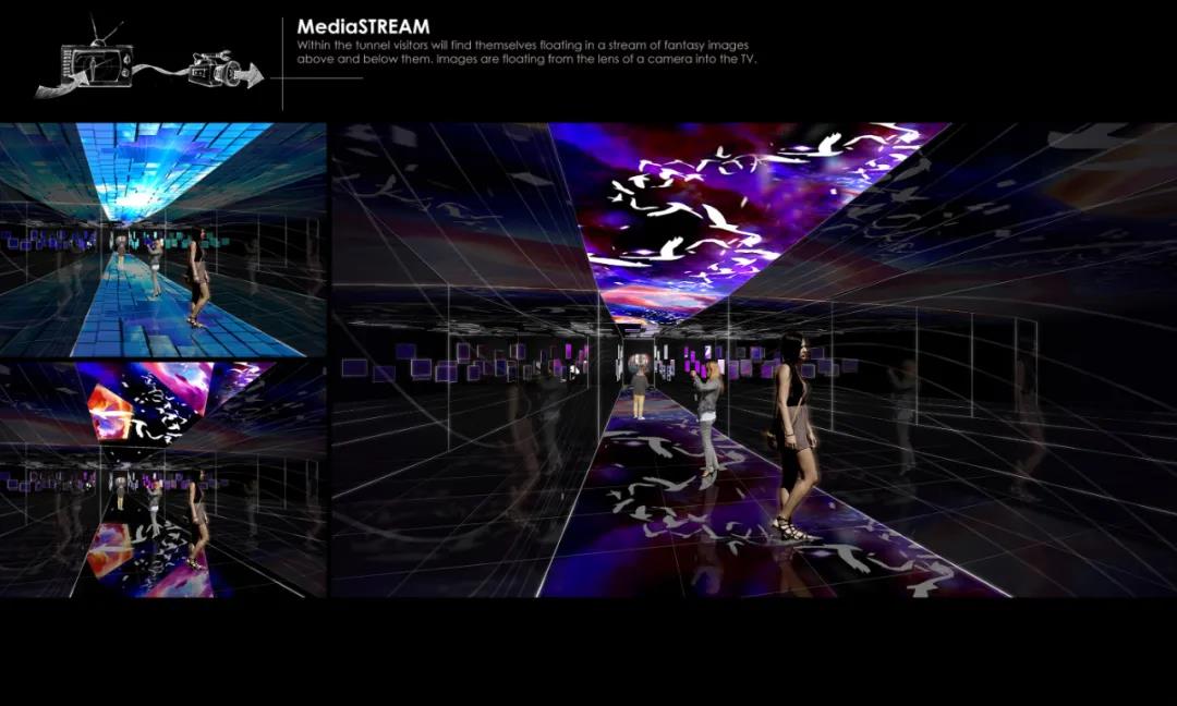 媒体流在隧道里,游客们会发现自己漂浮在他们上面和下面的一系列幻想图像中。影像从照相机的镜头浮到电视上。