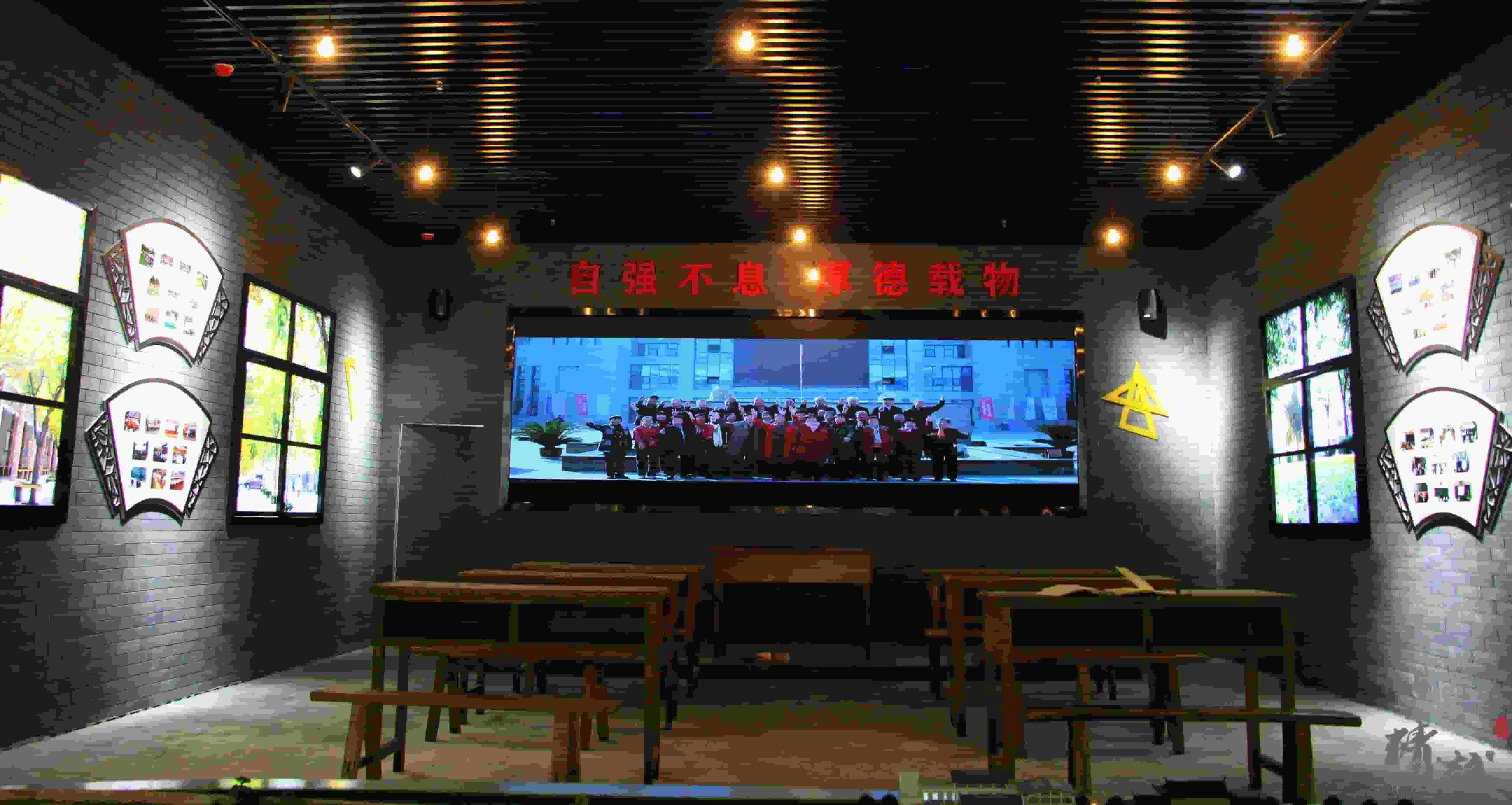 展馆的设计采用素雅的色彩和简约的线条,通过传统与现代相结合的模式,充分利用空间造型艺术、多媒体技术等手段,以及运用校史馆元素,体现独具特色的校史文化。