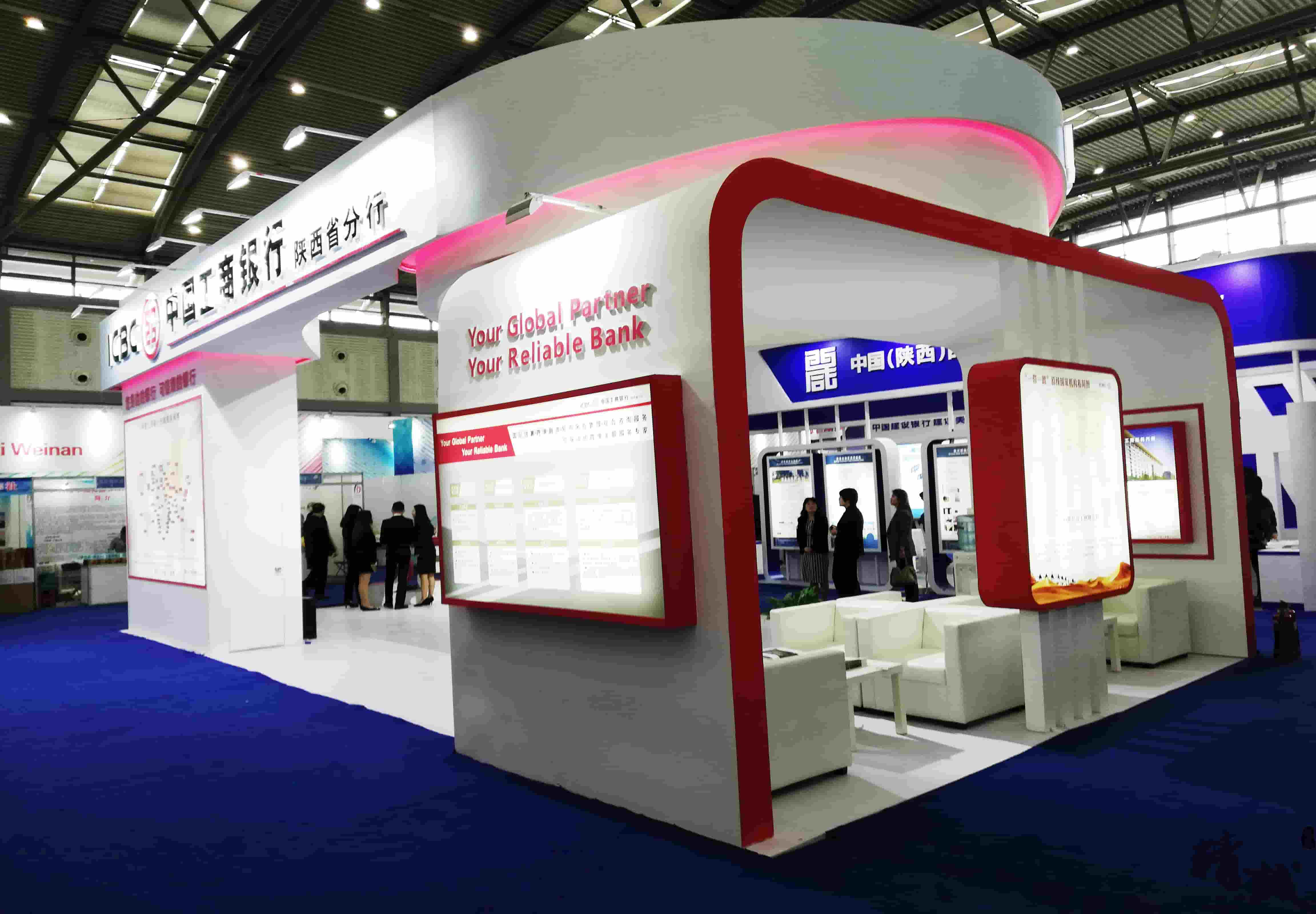 中国工商银行展位采用开敞式的布局,能够使参观者在其中自由参观;色彩上以白色为主,红色作为点缀,运用合理的灯光进行搭配,营造出干净、简约的展陈氛围。展区内部采用声、光、电相结合的现代展示手法,打造功能合理、展陈明确的展位形象。