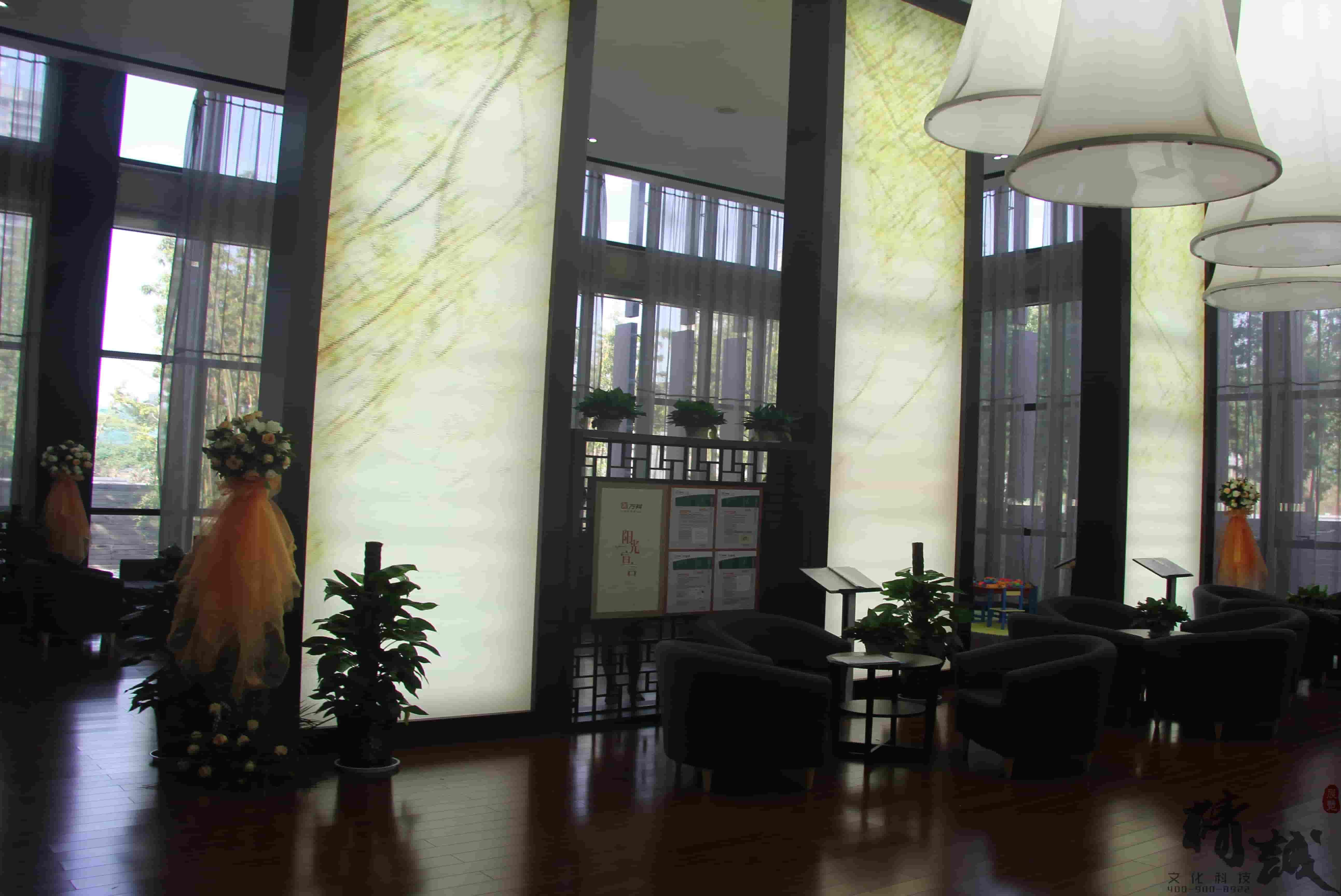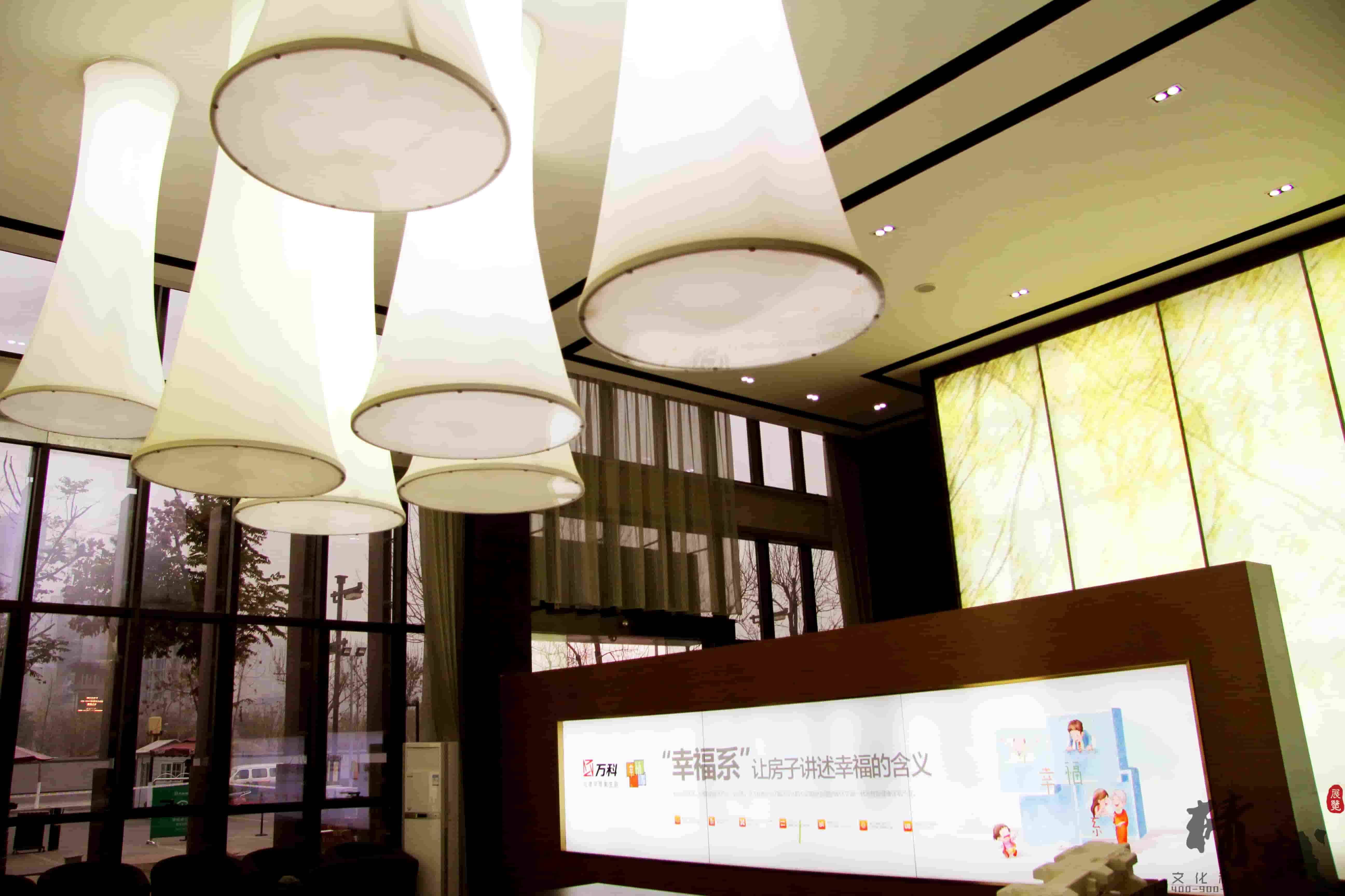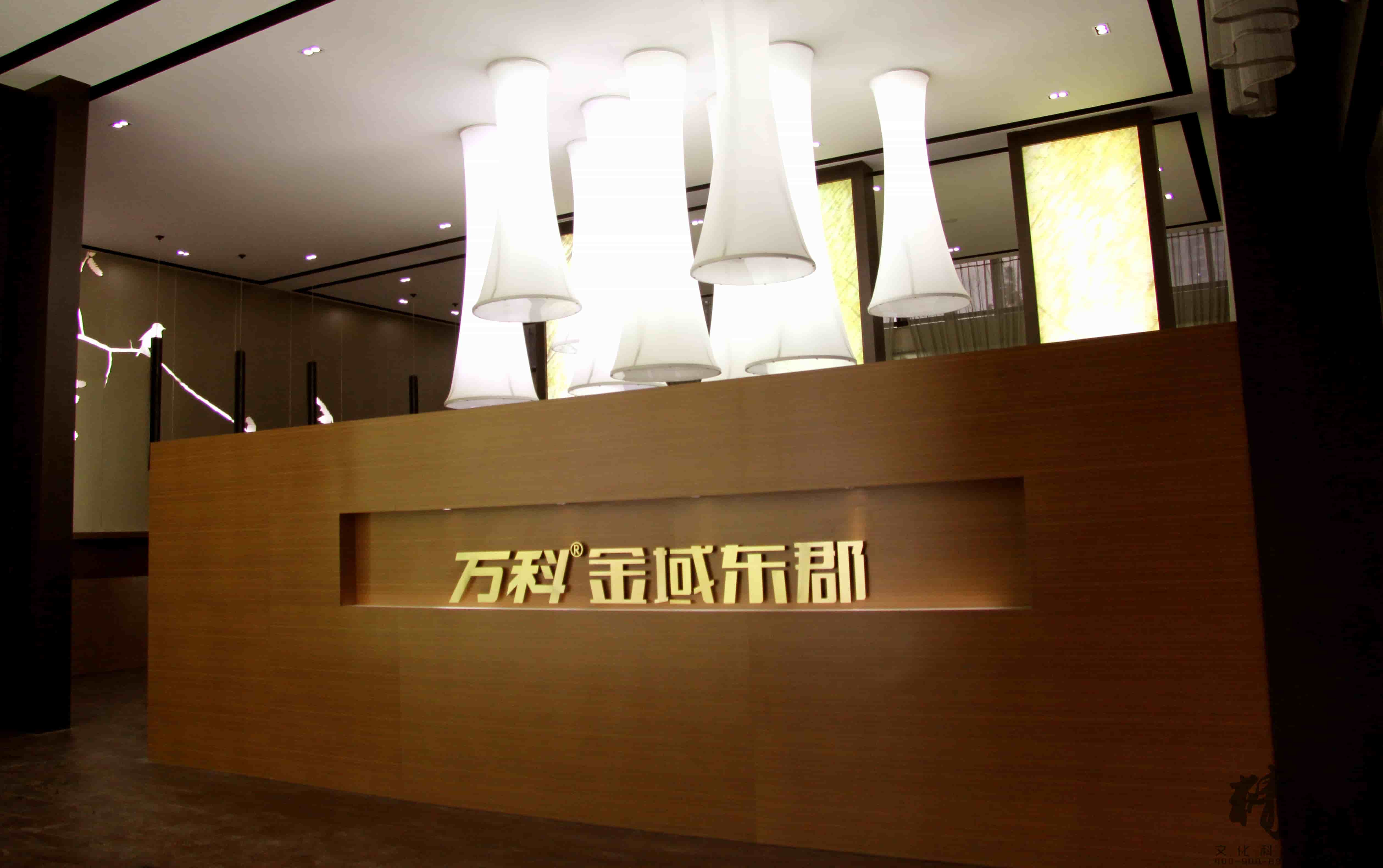 对于万科金域东郡的装饰装修设计整个展厅色调以稳重的棕色为主,用适当的金色作为点缀,显得整个展厅高端、大气。大厅顶部悬挂的创意灯饰和墙面花语林鸟的灯光修饰,则为展厅带来一丝清幽的新意,犹如清风拂面。